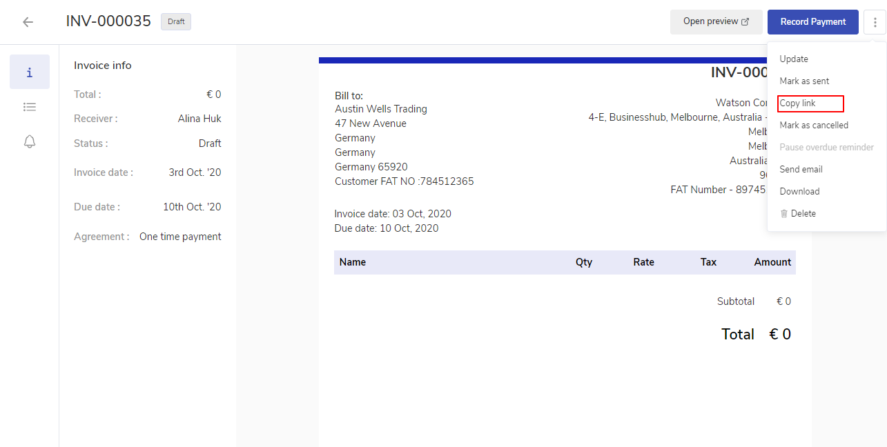 How can I get shareable link for the Invoice?